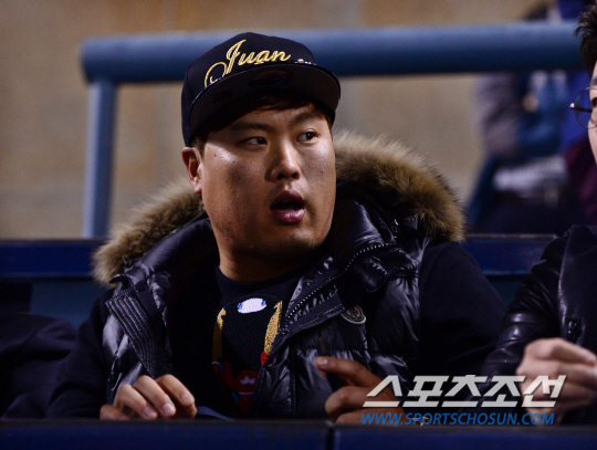 24일 잠실구장에서 2014프로야구 준PO 3차전 LG 트윈스와 NC 다이노스의 경기가 열렸다. LG가 마산 원정 1, 2차전을 승리하며 PO 진출에 1승 만을 남겨놓고 있다. 잠실 야구장을 찾은 류현진이 경기를 지켜보고 있다. 잠실=김경민 기자 kuyngmin@sportschosun.com / 2014.10.24.