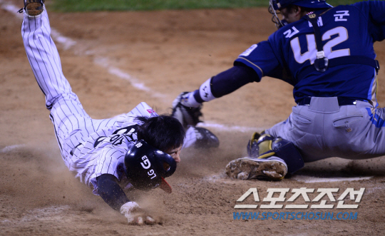 하지만 김태군은 곧바로 다음 장면에서 자신의 실수를 멋지게 만회했다. 포수의 또 다른 업무. 주자의 홈쇄도를 완벽하게 막은 것이다. 계속된 1사 3루 때 이병규는 바뀐 투수 이민호를 상대로 2루 땅볼을 쳤다. LG 3루 주자 황목치승이 스타트를 끊었고, 공을 잡은 NC 2루수 박민우도 동시에 재빨리 홈으로 공을 던졌다.