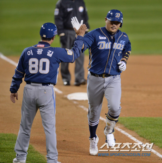 24일 잠실구장에서 2014프로야구 준PO 3차전 LG 트윈스와 NC 다이노스의 경기가 열렸다. LG가 마산 원정 1, 2차전을 승리하며 PO 진출에 1승 만을 남겨놓고 있다. 6회초 1사서 NC 이호준이 우중월 솔로홈런을 친 후 이광길 코치와 하이파이브를 나누고 있다. 잠실=김경민 기자 kuyngmin@sportschosun.com / 2014.10.24.