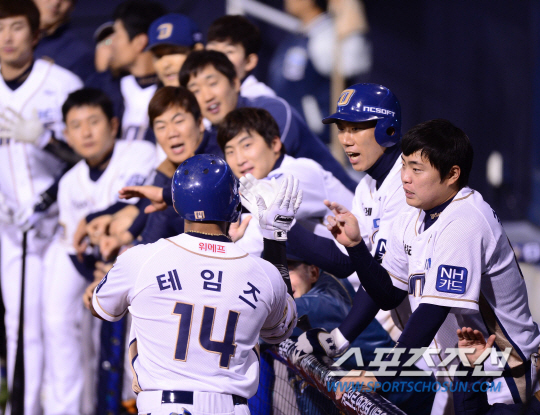 22일 경남 창원시 마산구장에서 프로야구 준플레이오프(준PO) 2차전 NC다이노스와 LG트윈스의 경기가 열렸다. 7회말 무사서 NC 테임즈가 우월 솔로홈런을 친 후 동료들과 환호하고 있다. 창원=김경민 기자 kyungmin@sportschosun.com / 2014.10.22.