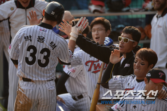LG와 NC의 2014 프로야구 준플레이오프 4차전 경기가 25일 잠실구장에서 열렸다. 5회말 1사 2루 LG 이병규의 좌전안타때 홈을 밟은 2루주자 박용택이 기쁨을 나누고 있다. 잠실=허상욱 기자 wook@sportschosun.com/2014.10.25/
