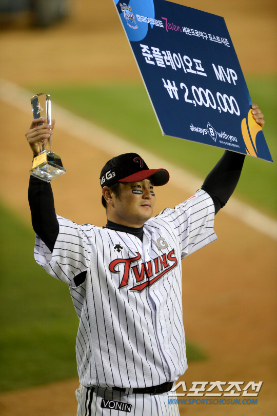 LG와 NC의 2014 프로야구 준플레이오프 4차전 경기가 25일 잠실구장에서 열렸다. LG가 11대3으로 승리하며 준플레이오프 전적 3승 1패로 플레이오프에 진출했다. 준플레이오프 MVP LG 최경철이 포즈를 취하고 있다. 잠실=허상욱 기자 wook@sportschosun.com/2014.10.25/