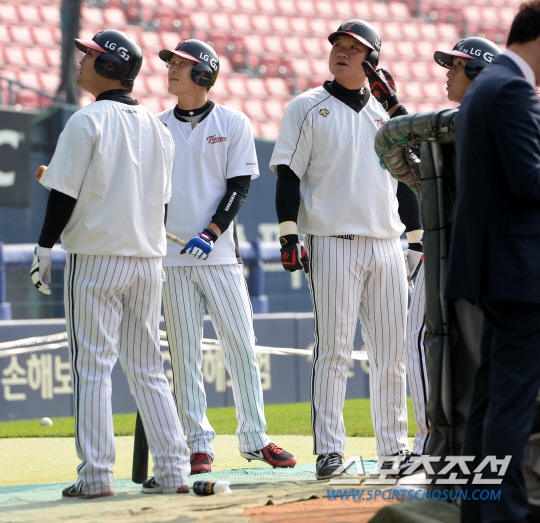 LG와 NC의 2014 프로야구 준플레이오프 4차전 경기가 25일 잠실구장에서 열렸다. LG 정의윤, 문선재, 최승준, 김영관이 타격훈련을 하며 이야기를 나누고 있다. 잠실=허상욱 기자 wook@sportschosun.com/2014.10.25/