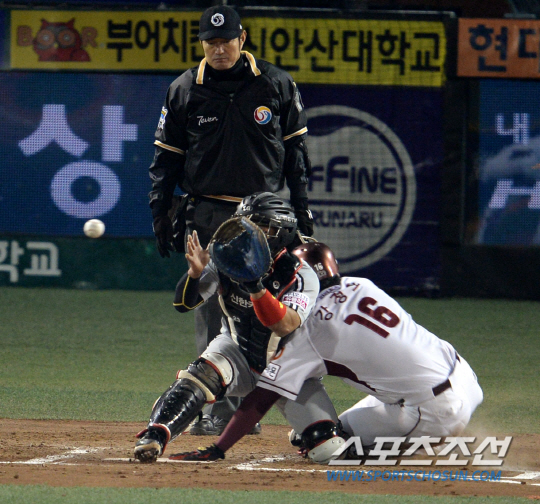 하지만 이번에는 양 감독이 틀렸다. 중계화면 영상을 보니 강정호가 홈을 막은 최경철의 다리 사이로 손을 넣어 홈베이스를 먼저 찍는 장면이 명확하게 나타났다. 그래서 판정은 번복되지 않았다.