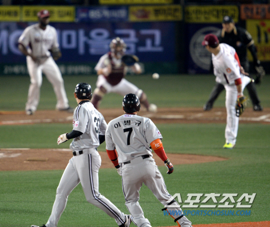 0-1로 뒤진 3회초 LG 공격. 손주인과 정성훈의 연속 볼넷에 이어 김용의가 페이크 번트 앤드 슬래시로 투수 앞 땅볼 타구를 날렸다. 이때 넥센 내야진이 성급하게 베이스를 비우는 바람에 모든 주자가 살았다. 무사 만루 찬스.