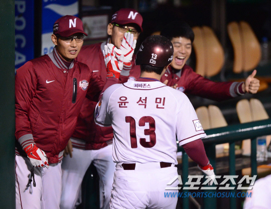 27일 서울 목동야구장에서 2014 프로야구 LG와 넥센의 플레이오프 1차전이 열렸다. 6회말 1사 2,3루서 넥센 윤석민이 우월 3점 홈런을 친 후 염경엽 감독과 환호하고 있다. 목동=김경민 기자 kuyngmin@sportschosun.com / 2014.10.27.