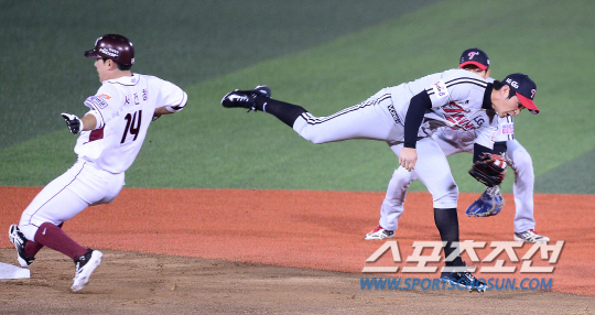 27일 서울 목동야구장에서 2014 프로야구 LG와 넥센의 플레이오프 1차전이 열렸다. 1회말 무사 1루서 1루주자 서건창이 이택근의 내야 땅볼 때 유격수 오지환에게 태그아웃되고 있다. 목동=김경민 기자 kuyngmin@sportschosun.com / 2014.10.27.