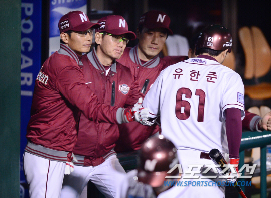 28일 서울 목동야구장에서 2014 프로야구 LG와 넥센의 플레이오프 2차전이 열렸다. 7회말 1사서 넥센 유한준이 우중월 솔로홈런을 친 후 덕아웃에서 염경엽 감독과 환호하고 있다. 목동=김경민 기자 kuyngmin@sportschosun.com