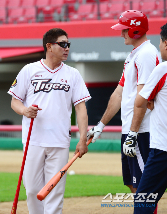 롯데 자이언츠와 KIA 타이거즈의 2014 프로야구 경기가 10일 광주 챔피언스필드에서 열린다. 경기 전 한대화 감독이 필에게 타격에 대한 조언을 하고 있다. 광주=정재근 기자 cjg@sportschosun.com/2014.08.10/