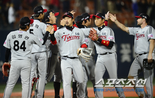 LG 트윈스와 넥센 히어로즈의 2014 프로야구 플레이오프 2차전이 28일 목동구장에서 열렸다. 9-2의 승리를 거둔 LG 선수들이 승리를 자축하고 있다. 1차전은 넥센이 6-3의 승리를 거두며 기선을 제압했다. 2차전에서 LG는 신정락을, 넥센은 밴헤켄을 선발로 내세웠다. 목동=정재근 기자 cjg@sportschosun.com/2014.10.28/