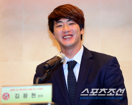 29일 오후 서울 상암동 스텐포드 호텔에서 SK 김광현의 메이저리그 진출 추진 기자회견이 열렸다. 메이저리그는 수년 전부터 김광현을 스카우트 1순위로 점찍었다. 류현진에 비해 제구력이 떨어지지만 파워는 오히려 뛰어나다는 평가를 받았다. 류현진처럼 2573만 달러의 이적료를 받기는 어려워도 500만 달러 이상을 입찰한 구단이 나온다면 SK가 미국 진출을 허락할 가능성이 크다. SK는 다음주 한국야구위원회(KBO)에 김광현에 대한 포스팅을 요청할 예정이다. 기자회견에서 김광현이 소감을 밝히고 있다. 김경민 기자 kyunmgin@sportschosun.com / 2014.10.29.