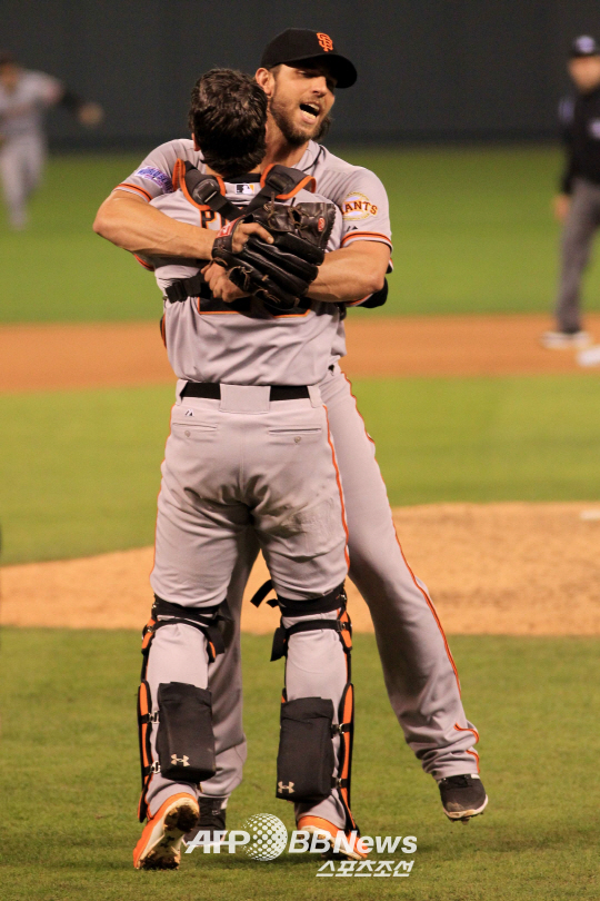 샌프란시스코 자이언츠의 투수 매디슨 범가너와 포수 버스터 포지가 30일(한국시각) 캔자스시티와의 월드시리즈 7차전서 승리를 확정지은 뒤 기쁨의 포옹을 하고 있다. ⓒAFPBBNews = News1