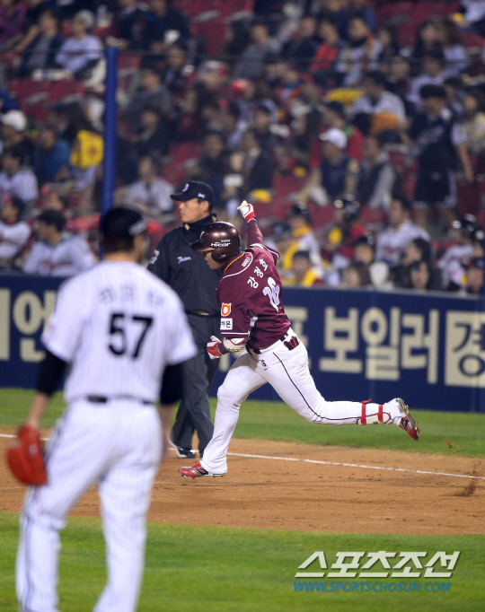 30일 잠실구장에서 2014 프로야구 플레이오프 3차전 LG 트윈스와 넥센 히어로즈의 경기가 열렸다. LG-넥센은 시리즈 1승 1패를 기록 중이다. LG 리오단과 넥센 오재영이 선발 맞대결을 펼쳤다. 넥센 강정호가 2회 LG 리오단을 상대로 솔로홈런을 날렸다. 리오단이 지켜보는 가운데 그라운드를 돌고 있는 강정호. 잠실=송정헌 기자 songs@sportschosun.com/2014.10.30