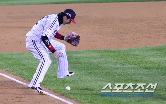 30일 서울 잠실야구장에서 2014 프로야구 LG와 넥센의 플레이오프 3차전이 열렸다. 5회초 무사 1,2루서 LG 손주인이 이성열의 번트를 피하고 있다. 잠실=김경민 기자 kuyngmin@sportschosun.com / 2014.10.30.