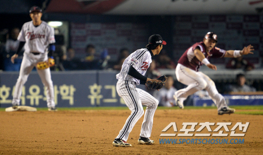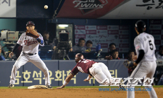 LG 트윈스 키다리 2루수 김용의(키 1m87)가 날아온 직선타를 한 차례 글러브 맞고 튀어 오른 걸 다시 잡았다. 그리고 바로 1루로 던저 동시에 아웃카운트 2개를 만들면서 이닝을 마쳤다.