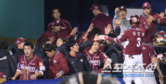 2014 프로야구 넥센히어로즈와 LG트윈스의 플레이오프 4차전 경기가 31일 잠실야구장에서 열렸다. 넥센 1회초 1사 2,3루에서 희생플라이로 추가타점을 올린 김민성이 동료들의 환영을 받고 있다. 잠실=최문영 기자 deer@sportschosun.com