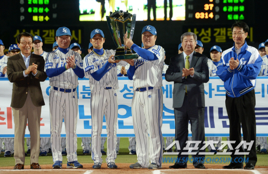 삼성과 KIA의 2014 프로야구 경기가 16일 대구 시민구장에서 열렸다. 경기 전 삼성 라이온즈 주장 최형우가 KBO 구본능 총재로부터 정규시즌 우승트로피를 전달받고 있다. 왼쪽부터 삼성라이온즈 김인 사장, 류중일 감독, 김상수, 최형우, KBO 구본능 총재, 삼성 라이온즈 안현호 단장 대구=허상욱 기자 wook@sportschosun.com