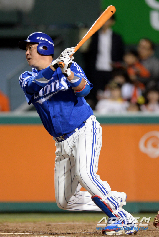 한화와 삼성의 2014 프로야구 경기가 13일 대전 한밭구장에서 열렸다. 5회초 2사 1,2루 삼성 진갑용이 중견수 앞 2타점 적시타를 치고 있다. 대전=허상욱 기자 wook@sportschosun.com/2014.10.13/ |