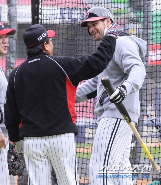 2014 프로야구 넥센히어로즈와 LG트윈스의 플레이오프 4차전 경기가 31일 잠실야구장에서 열렸다. 경기전 LG 김무관 코치가 스나이더에게 타격지도를 하고 있다. 잠실=최문영 기자 deer@sportschosun.com /2014.10.31/