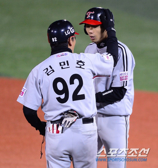 27일 서울 목동야구장에서 2014 프로야구 LG와 넥센의 플레이오프 1차전이 열렸다. 3회초 무사 1,2루서 LG 김용의가 내야 안타를 성공시킨 후 김민호 코치와 환호하고 있다. 목동=김경민 기자 kuyngmin@sportschosun.com / 2014.10.27.