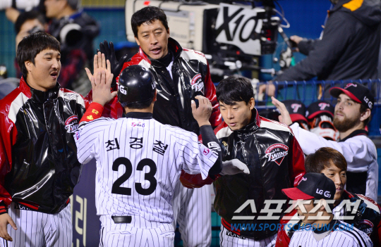31일 서울 잠실야구장에서 2014 프로야구 LG와 넥센의 플레이오프 4차전이 열렸다. 3회말 1사 2루서 LG 정성훈의 적시타 때 홈에 들어온 LG 최경철이 이진영, 이병규와 환호하고 있다. 잠실=김경민 기자 kuyngmin@sportschosun.com / 2014.10.31.