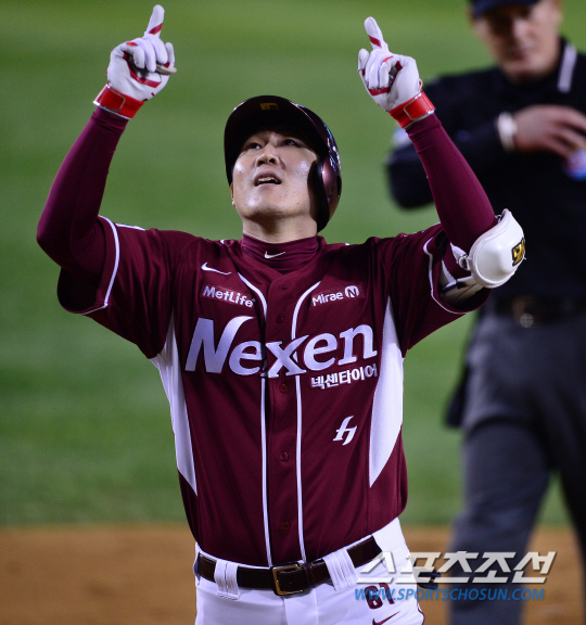 30일 서울 잠실야구장에서 2014 프로야구 LG와 넥센의 플레이오프 3차전이 열렸다. 8회초 1사서 넥센 유한준이 좌중월 솔로홈런을 친 후 홈에서 특유의 세리머니를 펼치고 있다. 잠실=김경민 기자 kuyngmin@sportschosun.com / 2014.10.30.
