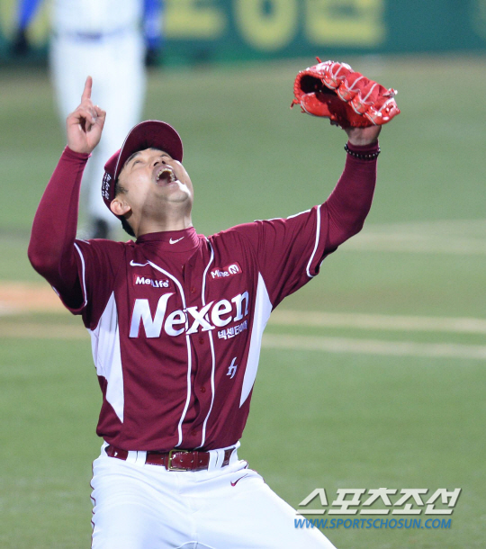 2014 프로야구 한국시리즈 1차전 삼성라이온즈와 넥센히어로즈의 경기가 4일 대구시민운동장에서 열렸다. 넥센 마무리 손승락이 삼성 9회말 2사 1루에서 박석민을 포수 파울플라이 처리한후 포효하고 있다. 대구=최문영 기자 deer@sportschosun.com /2014.11.04/