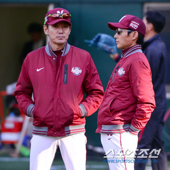 7일 오후 서울 목동야구장에서 열릴 2014 프로야구 한국시리즈 3차전에 앞서 넥센 염경엽 감독이 이강철 코치와 선수들의 훈련을 지켜보고 있다. 목동=김경민 기자 kyungmin@sportschosun.com / 2014.11.07.