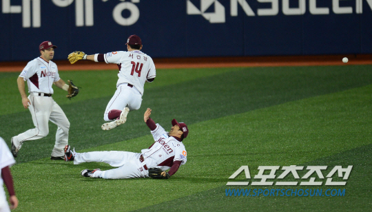 삼성 라이온즈와 넥센 히어로즈의 2014 프로야구 한국시리즈 3차전이 7일 목동구장에서 열렸다. 손가락 인대부상을 당한 삼성 박해민이 8회초 2사 1루 삼성 이승엽의 빗맞은 타구를 서건창, 이택근, 로티노가 달려와 잡으려 했지만 실패하고 있다. 목동=정재근 기자 cjg@sportschosun.com/2014.11.07/