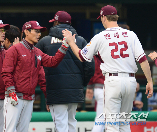 염 감독은 "선수들에게 부담되는 경기였는데 승리에 대한 집중력과 열정, 절실함으로 승리를 만들어준 선수들 칭찬하고 싶다"면서 "밴헤켄이 완벽한 피칭을 해줬다. 내 생각 이상의 피칭을 해서 쉬운 시합 할 수 있었다"며 선발 밴헤켄을 특히 칭찬했다.