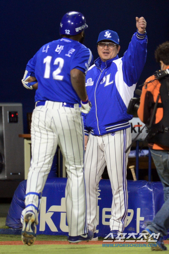 11일 오후 서울 잠실야구장에서 2014 프로야구 한국시리즈 5차전 삼성과 넥센의 경기가 열렸다. 6회초 무사 1,2루서 삼성 나바로가 좌중월 3점 홈런을 친 후 류중일 감독과 환호하고 있다. 잠실=김경민 기자 kyungmin@sportschsun.com / 2014.11.11.