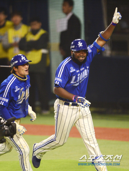 삼성 라이온즈와 넥센 히어로즈의 2014 프로야구 한국시리즈 6차전이 11일 서울 잠실구장에서 열렸다. 6회초 무사 1,2루 삼성 나바로가 좌중월 3점홈런을 치고 들어오며 환호하고 있다. 잠실=정재근 기자 cjg@sportschosun.com/2014.11.11/