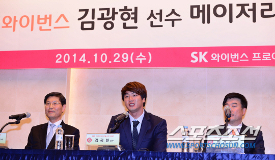 | SK 김광현 영입을 위해 최고 포스팅 금액을 적어낸 구단은 200만달러를 쓴 샌디에이고인 것으로 확인됐다. SK와 김광현 모두 받아들이기 힘든 액수다. 지난달 29일 메이저리그 진출 추진 기자회견을 하고 있는 김광현(가운데)과 SK 임원일 대표이사(왼쪽), 민경삼 단장. 김경민 기자 kyunmgin@sportschosun.com |