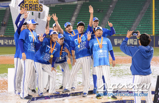 2014 프로야구 한국시리즈 6차전 삼성라이온즈와 넥센히어로즈의 경기가 11일 잠실야구장에서 열렸다. 삼성선수들이 넥센을 상대로 11대1로 승리하며 한국시리즈 우승을 확정짓고 환호하고 있다. 잠실=최문영 기자 deer@sportschosun.com /2014.11.11/ |