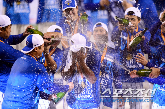 삼성과 넥센의 2014 프로야구 한국시리즈 6차전이 11일 잠실야구장에서 펼쳐 졌다. 우승을 차지한 삼성 선수들이 MVP 나바로에게 샴페인을 퍼부으며 즐거워 하고 있다. 잠실=조병관기자 rainmaker@sportschosun.com/2014.11.11/