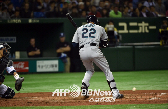 15일 도쿄돔에서 열린 일본올스타팀과의 경기 7회 니시가 던진 공에 오른쪽 발을 맞은 로빈슨 카노. ⓒAFPBBNews = News1