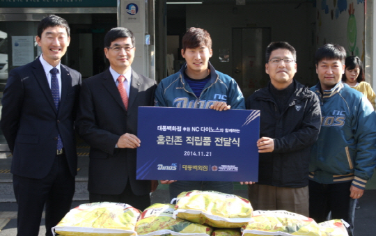 NC 다이노스가 21일 경남 창원시에 위치한 마산장애인복지관을 찾아 대동백화점 홈런존 운영으로 적립된 쌀 40포대를 전달했다.