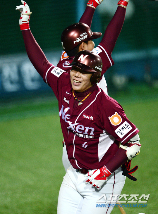넥센 히어로즈와 삼성 라이온즈의 2014 프로야구 한국시리즈 1차전이 4일 대구구장에서 열렸다. 8회초 무사 1루 넥센 강정호가 좌중월 투런포를 치고 들어오며 환호하고 있다. 대구=정재근 기자 cjg@sportschosun.com/2014.11.04/