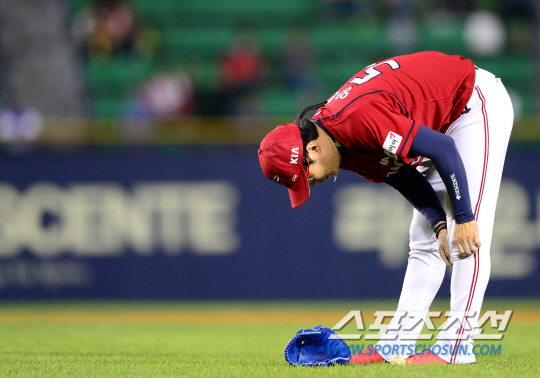 8일 잠실구장에서 프로야구 두산과 KIA의 경기가 열렸다. 두산은 유희관이 KIA는 양현종이 선발 출전해 맞대결을 펼쳤다. KIA 양현종이 3회말 2사 1,2루 위기에서 김현수를 1루수 앞 땅볼로 처리하며 이닝을 마쳤다. 유니폼을 정리하고 있는 양현종. 잠실=송정헌 기자 songs@sportschosun.com/2014.10.08 |