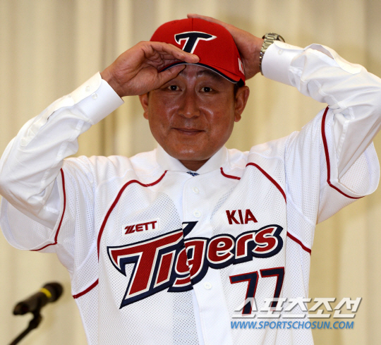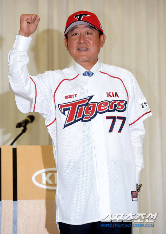 김 감독은 30일 광주광역시 서구 내방동 기아자동차 연구소강당에서 열린 공식 취임식을 통해 자신의 포부를 명확히 밝혔다. 이날 선수단과 구단 임직원이 모두 정장 차림으로 참석한 가운데 박한우 신임사장의 인사말에 이어 단상에 오른 김 감독은 '77번'이 새겨진 홈 유니폼과 모자를 전달받아 착용했다. '77'은 김 감독이 직접 선택한 번호다. LG 사령탑 시절 등번호는 '91'이었다. 이에 대해 김 감독은 "행운의 숫자 '7'을 겹쳐써서 행운이 두 배로 오기를 바라는 마음에서 골랐다"고 밝혔다.