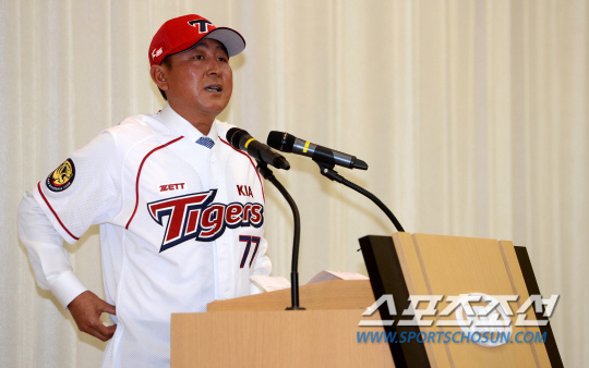 KIA 타이거즈 김기태 신임 감독이 취임식을 가졌다. 30일 광주 내방동 KIA 자동차 광주1공장 연구소 강당에서 열린 KIA 김기태 감독 취임식에서 김 감독이인사말을 하고 있다. 김기태 감독은 지난달 28일 KIA 사령탑에 선임됐으나 코칭스태프 선임과 마무리 캠프 합류 등을 이유로 취임식을 미뤘다. KIA는 지난 10월 29일 일본 미야자키 휴가에 마무리 캠프를 차렸고, 김 감독은 11월 2일 캠프에 합류해 선수들을 이끌었다. 광주=허상욱 기자 wook@sportschosun.com/2014.11.30/