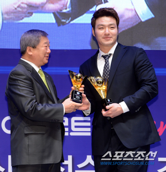 2014 프로야구 최우수선수(MVP)와 최우수신인선수 선정 및 각 부문별 시상식이 18일 오후 서울 양재동 더케이 호텔에서 열렸다. 최다홈런상과 최다타점상을 차지한 넥센 박병호가 구본능 총재로부터 트로피를 받고 있다. 허상욱 기자 wook@sportschosun.com/2014.11.18/