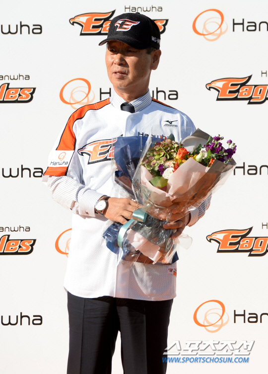 한화 신임 사령탑으로 부임한 김성근 감독이 취임식을 가졌다. 28일 대전구장에서 진행된 한화 김성근 감독의 취임식 및 기자회견에서 김성근 감독이 축하의 꽃다발을 받고 있다. 김성근 감독은 계약기간 3년 총액 20억원(계약금, 연봉 각각 5억원)에 계약을 체결했고 오는 2017년까지 한화 지휘봉을 잡게 됐다. 김성근 감독은 1984년 OB베어스 감독을 시작으로 태평양, 삼성, 쌍방울, LG, SK까지 프로야구 5개 팀 감독을 역임했다. 프로통산 2327경기에 출장해 1234승 57무 1036패를 기록했고 지난 2007년부터 2011년까지 SK 와이번스 감독 재임시절 3차례 팀을 우승으로 이끌었다. 대전=허상욱 기자 wook@sportschosun.com/2014.10.28/