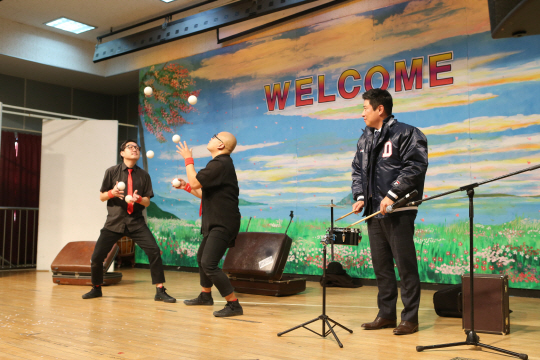 두산은 준비한 방한용 목도리, 방한용 모자 등의 선물을 전달했다.