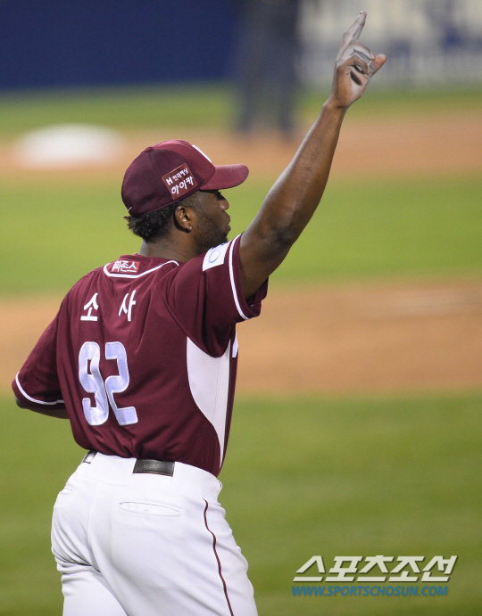 2014 프로야구 한국시리즈 5차전 삼성라이온즈와 넥센히어로즈의 경기가 10일 잠실야구장에서 열렸다. 넥센 소사가 삼성 3회말 1사 1루에서 최형우의 안타성 타구를 잡아낸 우익수 유한준에게 손짓하고 있다. 잠실=최문영 기자 deer@sportschosun.com /2014.11.10/