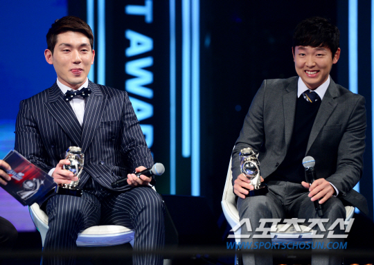 하지만 정작 서건창은 "정수빈이 내 폼을 따라해 만루홈런 치고도 고맙다고도 안하더라"며 볼멘 소리를 했다. 물론 행사분위기에 어울리는 농담이다. 하지만 정수빈도 당황하지 않고 맞받아쳤다. 정수빈은 "이렇게 공식적인 자리의 많은 사람앞에서 감사 인사를 하려고 아껴뒀다"면서 "건창이형 고맙습니다"라고 천연덕스럽게 말했다. 서건창은 그 천연덕스러움에 그저 허허 웃기만 할 뿐이었다.