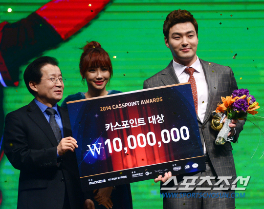 박병호는 8일 서울 장충동 신라호텔 다이너스티홀에서 열린 '2014 카스포인트 어워즈'에서 카스포인트(80%)와 카스포인트 어워즈 선정위원회(10%) 그리고 네티즌 투표(10%)에 의해 최고의 선수로 뽑혔다. 네티즌 이날 카스포인트 어워즈 행사 1부 종료시까지 진행됐다.