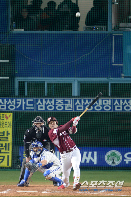 | 삼성과 넥센의 2014 프로야구 한국시리즈 1차전 경기가 4일 대구구장에서 열렸다. 8회초 무사 1루 넥센 강정호가 삼성 차우찬의 투구를 받아쳐 좌중간 담장을 넘어가는 재역전 2점홈런을 날리고 있다. 대구=허상욱 기자 wook@sportschosun.com/2014.11.04/ |
