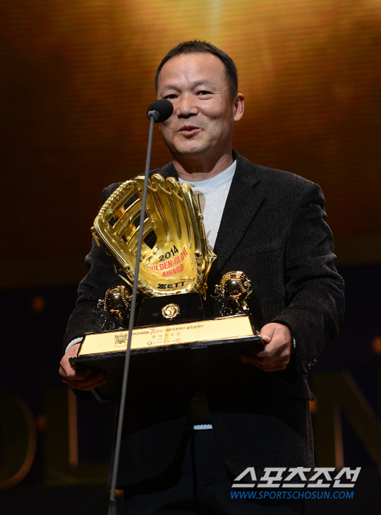 올 시즌 프로야구 포지션별 최고의 선수를 선정하여 시상하는 '2014 프로야구 골든글러브 시상식'이 9일 오후 서울 삼성동 코엑스 오디토리움에서 열렸다. 외야수 골든글러브를 수상한 삼성 최형우를 대신해 김평호 코치가 수상소감을 말하고 있다. 10개 부문 포지션별 황금장갑의 주인공은 올 시즌 프로야구를 취재, 중계한 미디어 관계자를 대상으로 12월 1일부터 5일까지 실시한 투표로 선정됐다. 정재근 기자 cjg@sportschosun.com/2014.12.09/ |