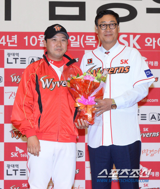 SK와이번스의 김용희 신임 감독 취임식과 이만수 전임 감독 이임식이 23일 인천 송도컨벤시아 2층 프리미어볼룸에서 열렸다. 김용희 신임감독이 주장인 박진만선수로 부터 환영의 꽃다발을 받고있다. 이날 행사는 개식선언, 전임 감독 감사패 전달 및 이임사, 신임 감독 유니폼 착복식, 꽃다발 전달, 신임 감독 계약서 사인, 신임 감독 취임사, 취재진 질의응답 순서로 진행됐다. SK의 제5대 감독으로 취임한 김용희 감독은 21일 2년 동안 계약금 3억원, 역봉 3억원 등 총액 9억원에 계약했다. 송도=최문영 기자 deer@sportschosun.com